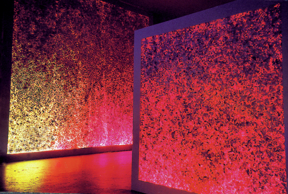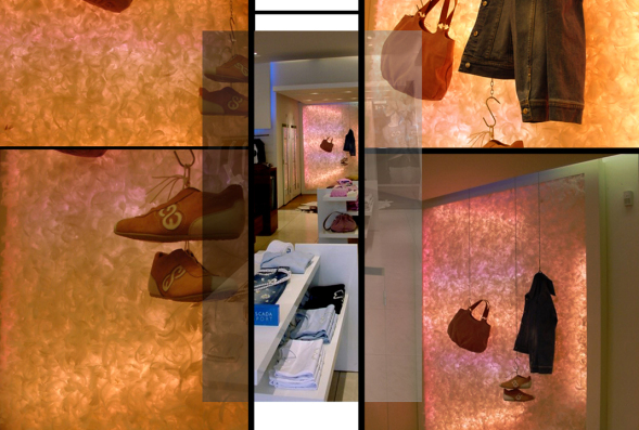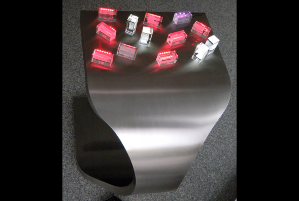 Die Arbeiten reichen von filigranen Papierlichtkunstwerken bis zu skulpturalen Objekten: Für Rofin-Sinar entsteht ein konvex-konkaves Lichtobjekt aus Edelstahl — eine plastische Arbeit, die Licht nicht zeigt, sondern formal mit ihm denkt.